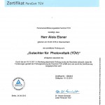 Der TÜV ist in Deutschland, in der EU und auf der ganzen Welt bekannt. TÜV, für viele Menschen zu Recht gleichbedeutend mit neutral geprüfter Qualität und Siegel für ein höchstes Maß an Sicherheit. Die TÜV Rheinland Group prüft und dokumentiert als internationaler Dienstleistungskonzern die Qualität des Fachwissens. Eine Zertifizierung und eine weitere Re-Zertifizierung wurden absolviert. Aufgrund der Lizenzpolitik jedoch keine ständigen Re-Zertifizierungen durchgeführt. Die Praxis-Rezertifizierung besteht in der laufenden Begutachtung und Begleitung von Projekten im Bereich der Photovoltaik und Speicher.