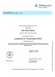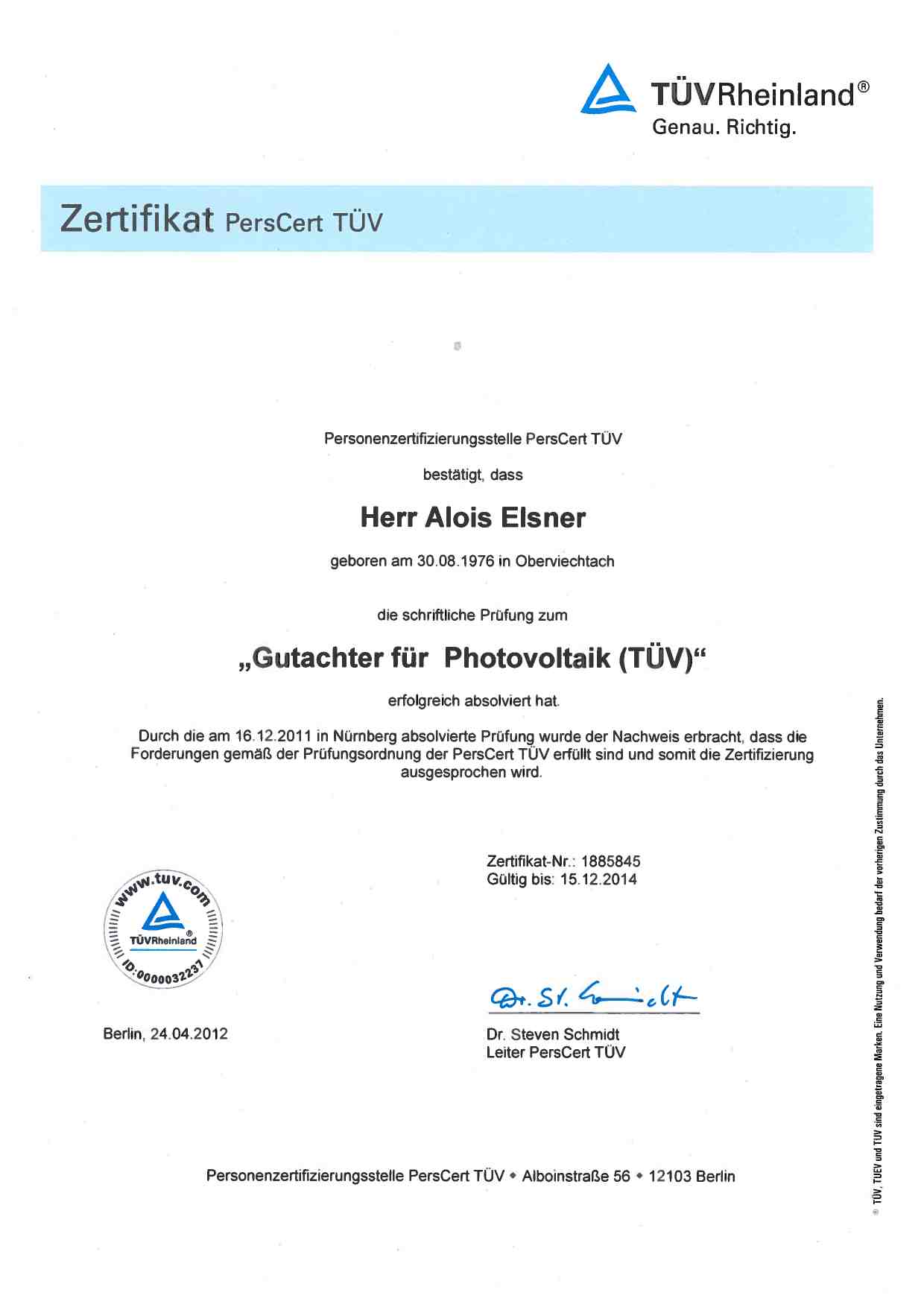 Alois Elsner, Dipl.-Ing. (FH), (TÜV) Sachverständiger für Photovoltaikanlagen